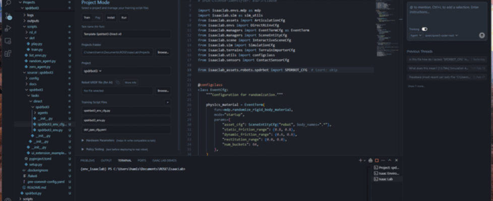 My aim for this post is to understand the best way to help RL (and specifically isaacsim/lab) beginners write training scripts for their own/existing robots. I really think people would be encouraged to get into robotics if this process was improved, so if anyone has any opinions on methods to make this process easier it would be great to hear them. What you are looking at in the post image, is the current UI for editing isaaclab projects. It helps users open and install any isaaclab project. There is “Hardware Parameters” UI section where the user can input the parameters of their robot, and this is fed directly to the AI to improve the responses, it also queries the isaaclab docs to correctly advice users. I’ve stuck to using skrl and PPO for now to keep things simple. Thanks for your time. submitted by /u/hamishlewis |