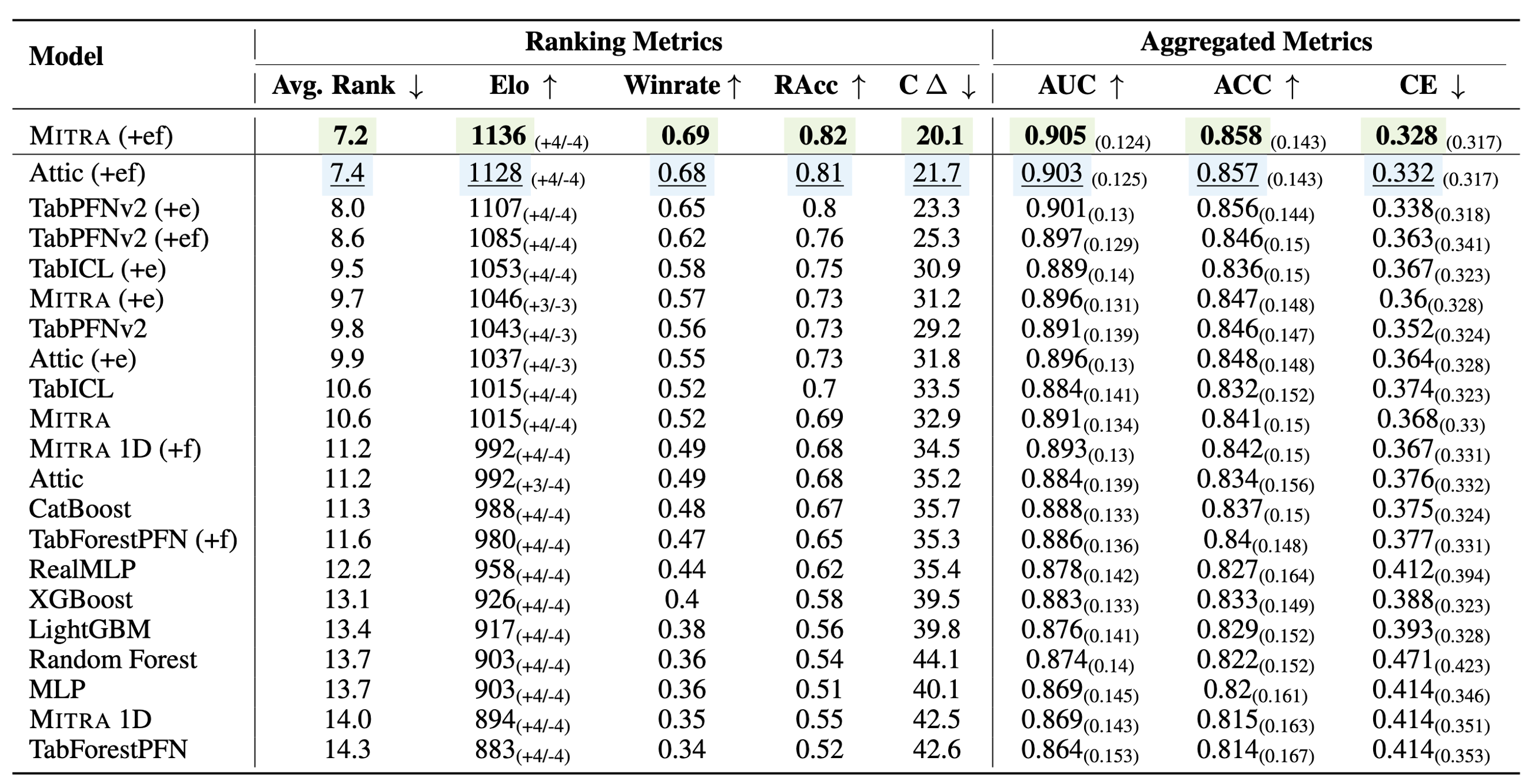 We evaluated Mitra on both classification and regression tasks, across major tabular benchmarks such as TabRepo, TabZilla, AMLB, and TabArena. Mitra demonstrated state-of-the-art performance when compared with strong TFMs such as TabPFNv2 and TabICL, as well as with dataset-specific models such as CatBoost, RealMLP, and AutoGluon 1.3 best-quality preset.