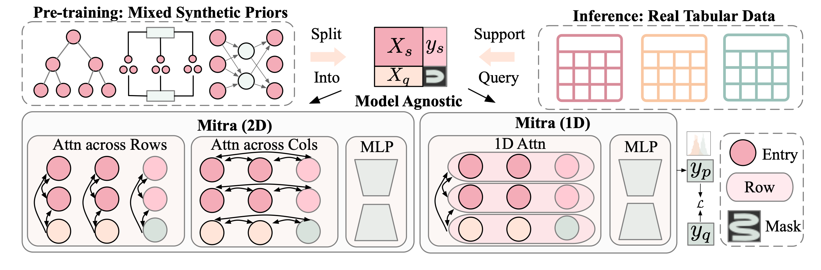 We pretrain Mitra on our selected mixture of priors. Each synthetic task consists of a support set and a query set. The model learns to predict the labels of the query set by attending to the support set; no gradient updates are required. Over millions of such tasks, Mitra learns generalizable patterns of reasoning and adaptation. The architecture is based on 2-D attention across both rows and features, allowing flexible handling of varying table sizes and feature interactions.