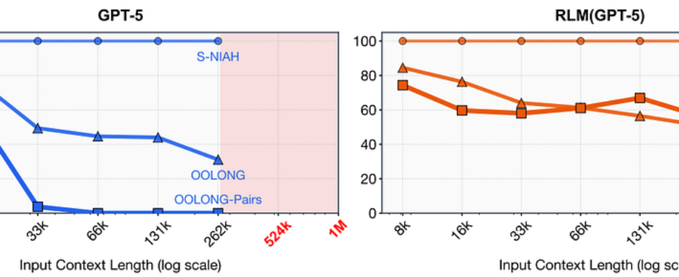 The lie exposed: GPT-5’s accuracy collapses at 33k tokens on hard tasks, while RLM stays strong past 1M tokens.