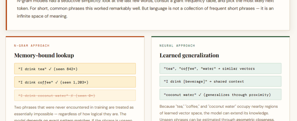 it may still do better because “espresso” lives near other drink-related words in embedding space. This was one of the first ways language models began to move from hard lookup to soft generalization.