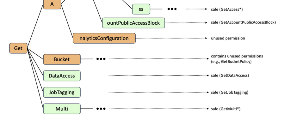We say that a node is safe (denoted in green in the diagram) if none of the unused actions start with the prefix corresponding to that node; otherwise, it is unsafe (denoted in orange). For example, the node s3:GetBucket is unsafe because the action s3:GetBucketPolicy is unused. Similarly, the node ss is safe since there are no unused permissions that start with GetAccess.