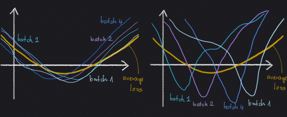 Both minima are the same as much as the average loss $C$ is concerned: the value of the minimum is the same, and the width of the two minima are the same. Yet, in the left-hand situation, the wide minimum arises as the average of several minibatch losses, which all look the same, and which all are relatively wide themselves. In the right-hand minimum, the wide average loss minimum arises as the average of a lot of sharp minibatch losses, which all disagree on where exactly the location of the minimum is.