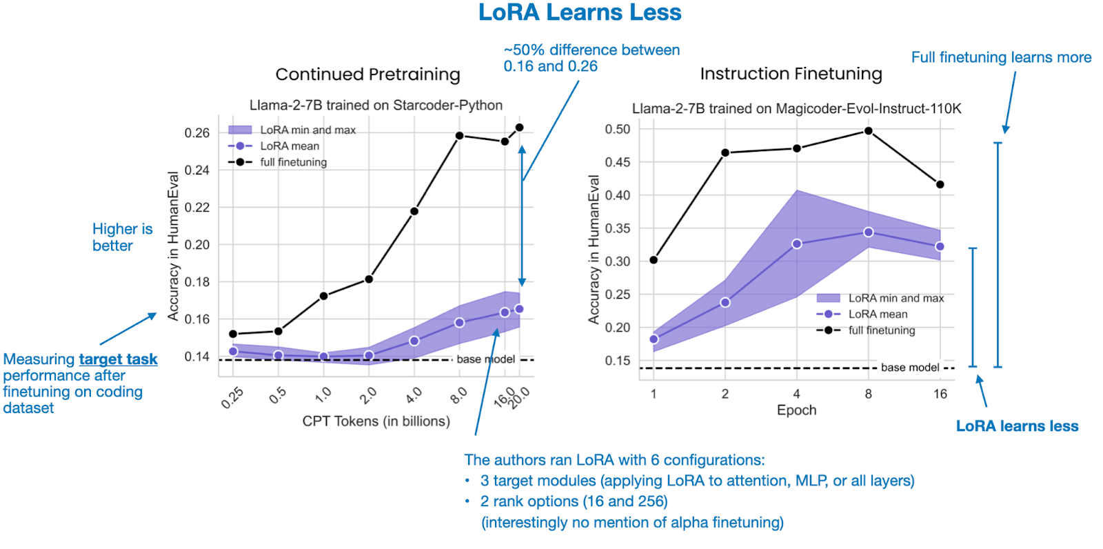 The LoRA Learns Less and Forgets Less study shows LoRA learns noticeably less than full finetuning, especially in tasks like coding, where new knowledge needs to be acquired. The gap is smaller when only instruction finetuning is performed. This suggests that pretraining on new data (learning new knowledge) benefit more from full finetuning than converting a pretrained model into an instruction follower.