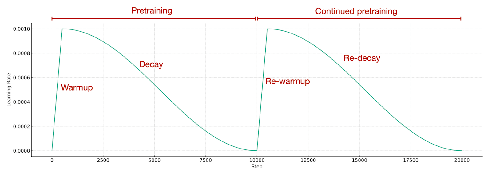 To be a bit more concrete regarding point 1, re-warming and re-decaying, this means we employ the exact same learning rate schedule that was used during the initial pretraining stage of an LLM as shown in the figure below.