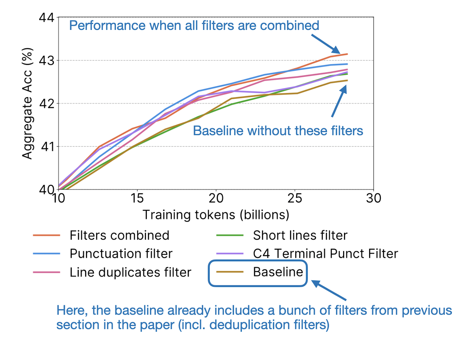 In addition, the paper contains principled ablation studies and insights into how the filtering rules were developed and applied to arrive at the FineWeb dataset (starting from the CommonCrawl web corpus). In short, for each filtering rule they tried, they took a 360 billion token random sample from the original and the filtered data and then trained a small 1.71 billion parameter Llama-like model to see whether the filtering rule is beneficial or not based on the models’ performances on standard benchmarks such as HellaSwag, ARC, MMLU, and others.