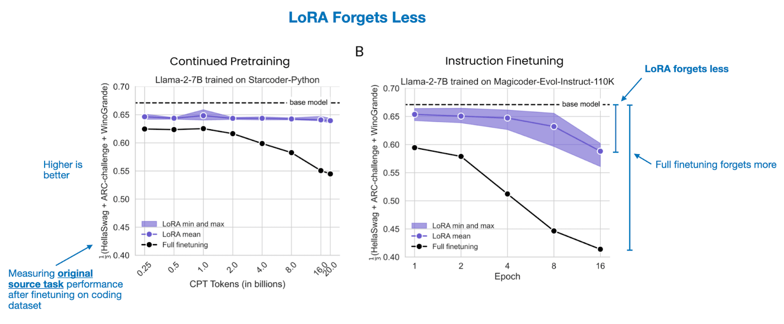 When examining how much previously acquired knowledge is lost, LoRA consistently forgets less. This is particularly clear when adapting to data far from the source domain (e.g., coding). With coding tasks, full finetuning leads to significant forgetting, while LoRA preserves more original capabilities. In math, where the model’s original knowledge was already closer to the new task, the difference is less pronounced.