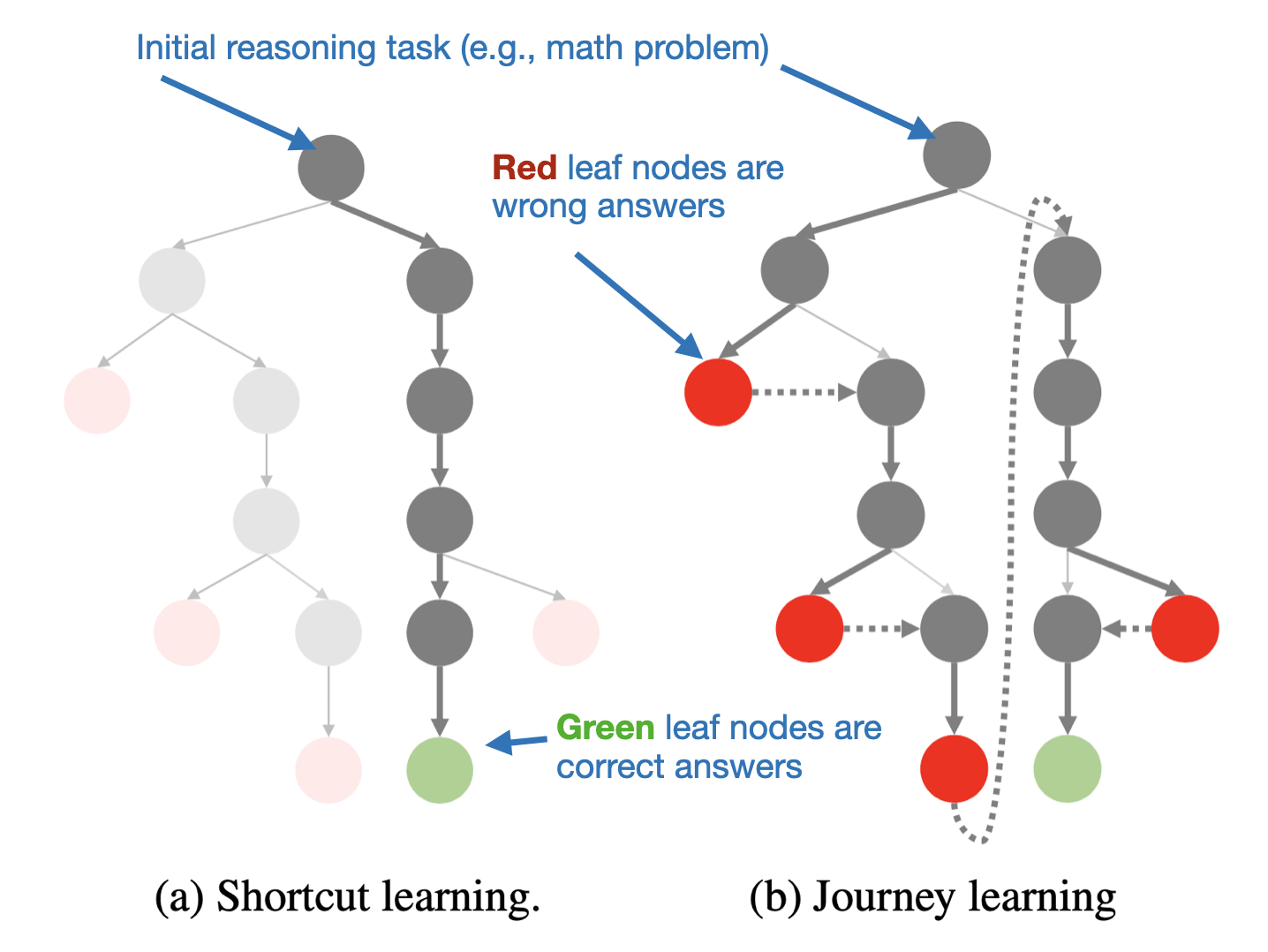 One of the key points of this paper is the researchers’ hypothesis that O1 employs a process called journey learning as opposed to shortcut learning, as illustrated in the figure below.