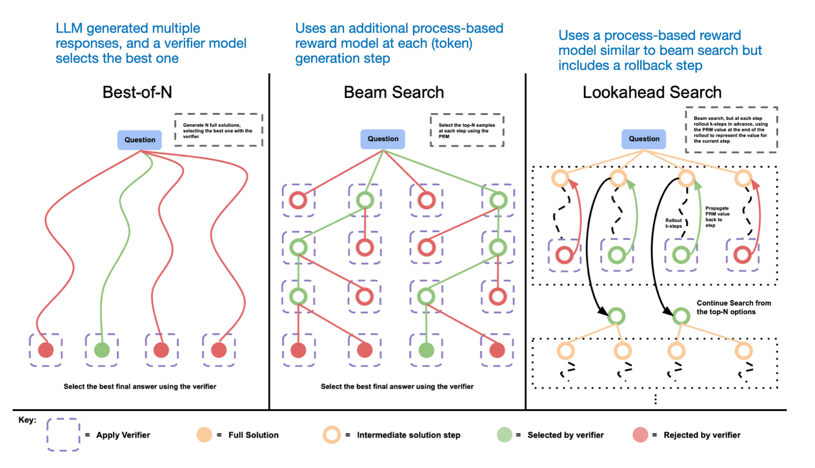 To provide a simple example for category 1: One naive way to improve test time compute is to use best-of-N sampling. This means that we let the LLM generate multiple answers in parallel and then pick the best one based on a verifier reward model. Best of N is also just one example. Multiple search algorithms fall into this category: beam-search, lookahead-search, and best-of-N, as shown in the figure below.