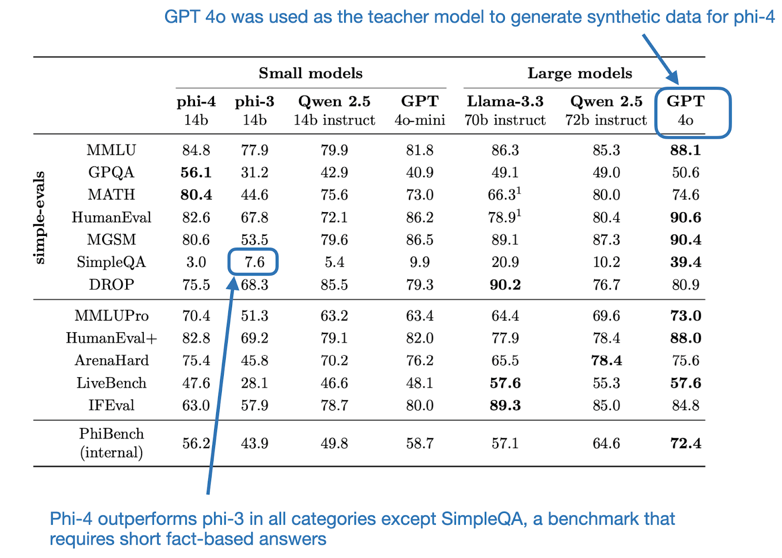 I’m not entirely sure why the model performs worse on SimpleQA, as shown in the table above. But one possible explanation is that SimpleQA is a relatively new benchmark, released on October 30, 2024. Since it was developed by OpenAI as part of their evaluation suite, it might not have been included in the training data for GPT-4o or incorporated into the web-crawled datasets. Furthermore, because GPT-4o was used to generate the synthetic data for this evaluation, none of the models would have encountered SimpleQA during training. However, phi-4 might be overfitting to other benchmarks, which could explain its comparatively lower performance on this unseen SimpleQA dataset. Anyways, that’s just my hypothesis.