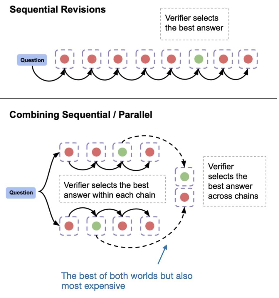 Another approach, which falls into category 2, is sequentially revising the model’s response, as illustrated in the figure below.