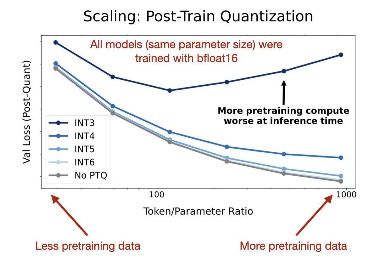 The figure below is a nice illustration that more pretraining data is not always better and can actually be harmful if models are quantized after training with very small precision (int3), which I found super interesting.