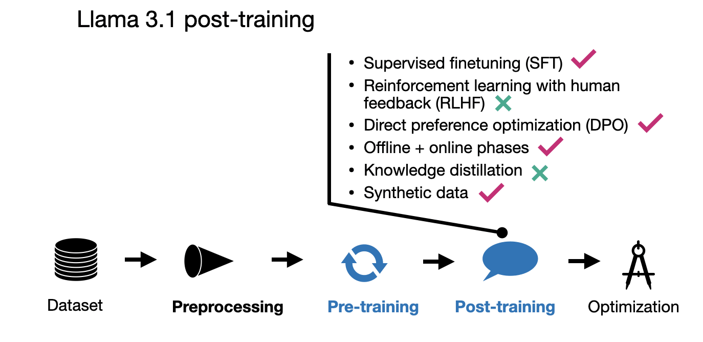 What’s notable about the Llama 3 model family is the increased sophistication of the pre-training and post-training pipelines compared to its Llama 2 predecessor. Note that this is not only true for Llama 3 but other LLMs like Gemma 2, Qwen 2, Apple’s Foundation Models, and others, as I described a few months ago in my New LLM Pre-training and Post-training Paradigms article.