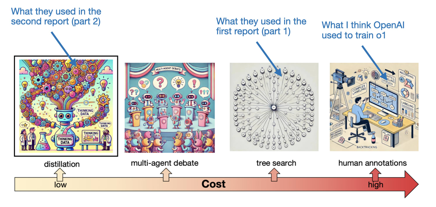 Here, they used a distillation approach, meaning they used careful prompting to extract the thought processes from o1 to train a model to reach the same performance. Since this is a long article, I won’t go over the details, but I wanted to share an interesting figure from that paper that summarizes the cost trade-offs of collecting long-thought data.