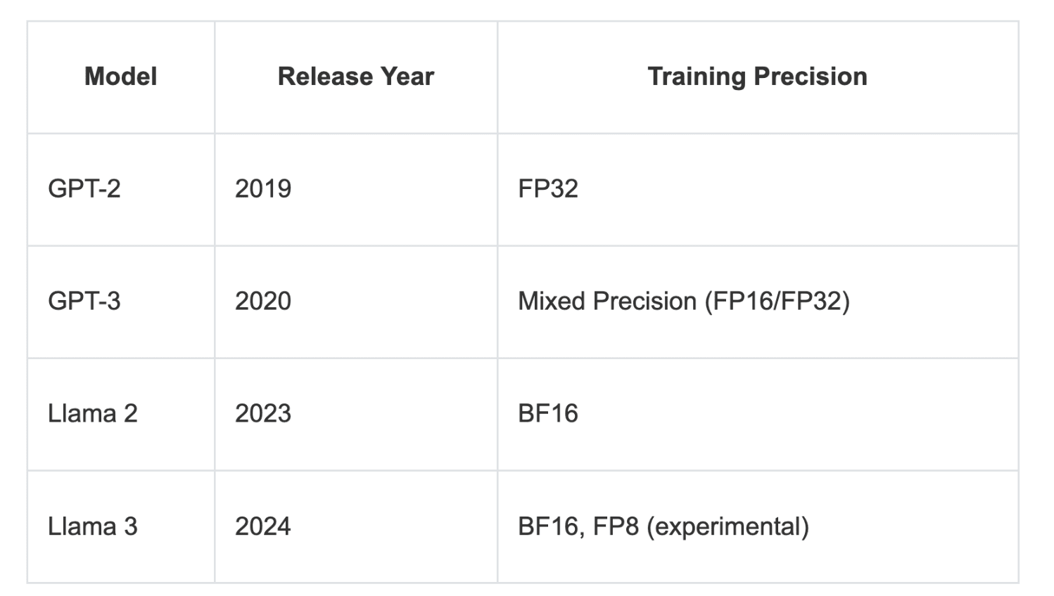 To the best of my knowledge, these were the precision formats used for training GPT 2 & 3 and Llama 2 & 3 models for comparison: