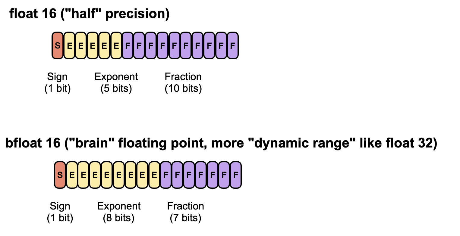 Bfloat16 (brain float 16) is also a 16-bit format but trades off some of float16’s precision for a larger exponent, allowing it to represent very large and very small numbers more effectively. As a result, bfloat16 can help avoid numeric overflow or underflow in deep learning applications, although its lower precision can still lead to rounding errors
