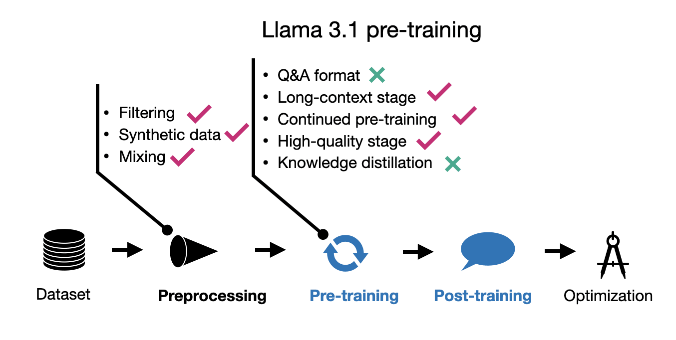 The pre-training process is now multi-staged. The paper primarily focuses on Llama 3.1, and for the sake of brevity, I have summarized its pre-training techniques in the figure below.