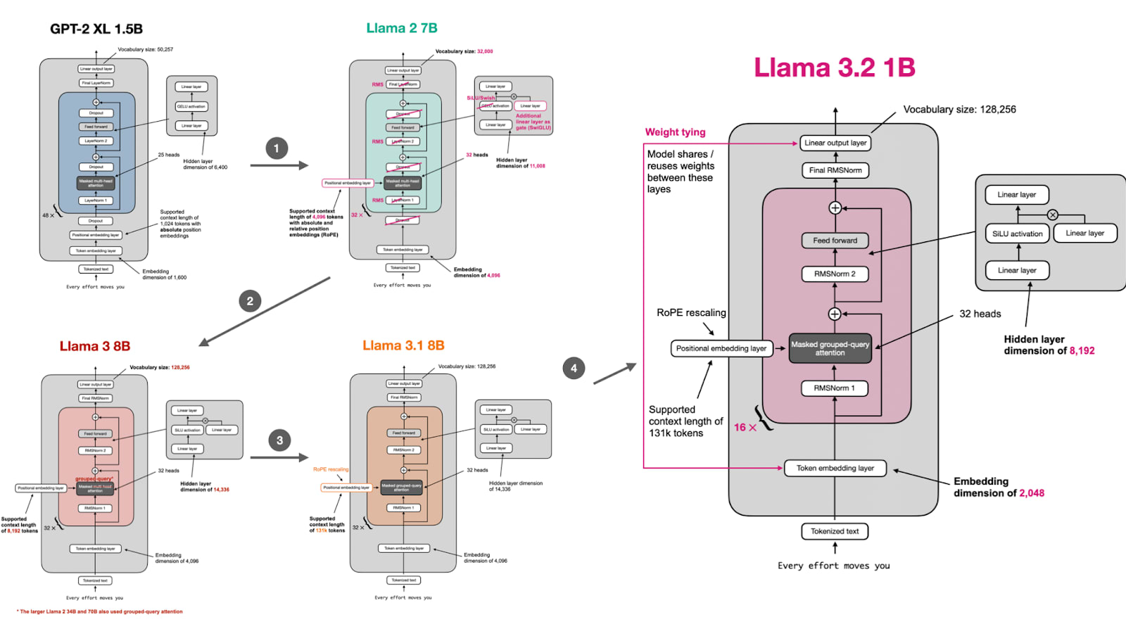 If you’re curious about architectural details, a great way to learn is by implementing the model from scratch and loading pretrained weights as a sanity check. I have a GitHub repository with a from-scratch implementation that converts GPT-2 to Llama 2, Llama 3, Llama 3.1, and Llama 3.2.