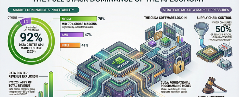 Author(s): Wahidur Rahman Originally published on Towards AI. How one company’s control over AI chips, software, and supply chains is rewriting the rules of innovation In the gold rush of artificial intelligence, NVIDIA isn’t selling shovels — it owns the mines, the refineries, and the roads connecting them. With a 92% stranglehold on the data center GPU market, the company has become something unprecedented: a near-monopoly at the heart of humanity’s most transformative technology. Source: The author generated this image using an AI tool to visually illustrate the concept.NVIDIA’s dominance extends beyond chip manufacturing to encompass strategic control over software and supply chains, making competition challenging. While it holds a significant market share, the company’s resilience comes from its software moat, pricing power, and deep integration with the AI ecosystem. All these aspects not only solidify NVIDIA’s leading position but also raise questions among regulators regarding potential anti-competitive practices, especially as the global AI landscape evolves rapidly and faces geopolitical pressures. Read the full blog for free on Medium. Join thousands of data leaders on the AI newsletter. Join over 80,000 subscribers and keep up to date with the latest developments in AI. From research to projects and ideas. If you are building an AI startup, an AI-related product, or a service, we invite you to consider becoming a sponsor. Published via Towards AI