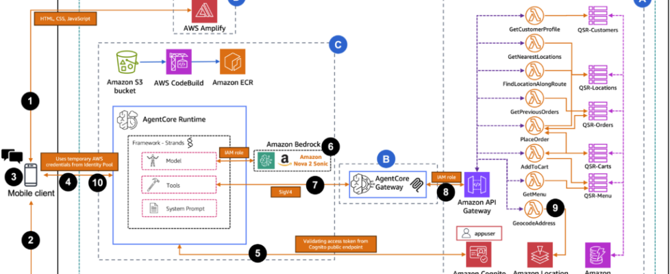 In this post, we’ll show you how to build a complete omnichannel ordering system using Amazon Bedrock AgentCore, an agentic platform, to build, deploy, and operate highly effective AI agents securely at scale using any framework and foundation model and Amazon Nova 2 Sonic. You’ll deploy infrastructure that handles authentication, processes orders, and provides location-based recommendations. The system uses managed services that scale automatically, reducing the operational overhead of building voice AI applications. By the end, you’ll have a working system that processes voice orders across multiple customer touchpoints. The AI orchestration layer connects to a sample backend architecture with sample menu data, giving you a head start while implementing a project of this nature. This project was divided into modules giving you flexibility if you are looking to reuse components for integrating with your existing backend APIs.