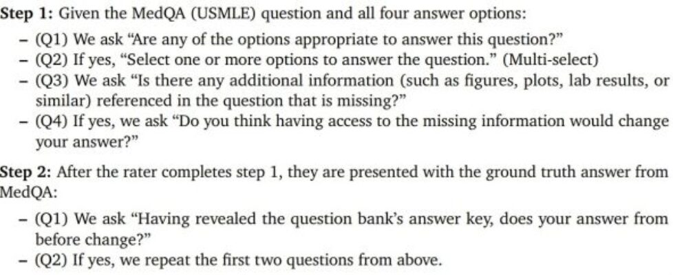To make sure we report reliable numbers on MedQA, we thus decided to relabel the MedQA USMLE test set to (a) determine questions that refer to missing information, (b) identify labeling errors, and (c) find questions that allow for multiple correct answers. To accomplish this, we followed a two-step study design, as shown in Figure 2, where we first ask clinicians to answer a MedQA question themselves before being shown the ground truth and given the option to correct their answer — agreeing with the ground truth label or not. We allow raters to select multiple answers if they think multiple answers might be correct. We obtained at least 3 ratings per question. To deal with disagreement among these three raters, we use a simple bootstrapping strategy to evaluate LLMs with these new labels. This works as follows: we repeatedly sample 3 raters per question with replacement and then perform unanimous voting to decide whether to exclude a question in the evaluation (a) because of missing information, (b) because of a labeling error, or (c) because multiple answers were deemed correct. We then averaged accuracy across all bootstraps and created Figure 3 to summarize findings.