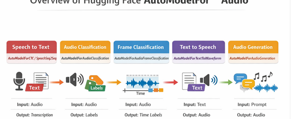 Audio models operate on waveforms or audio features instead of tokens. Hugging Face standardizes this workflow using: