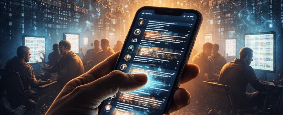IMAGE: A hand holds a glowing smartphone showing an endless social media feed, while surveillance cameras and streams of data loom overhead, symbolizing addictive design driven by data extraction and targeted advertising