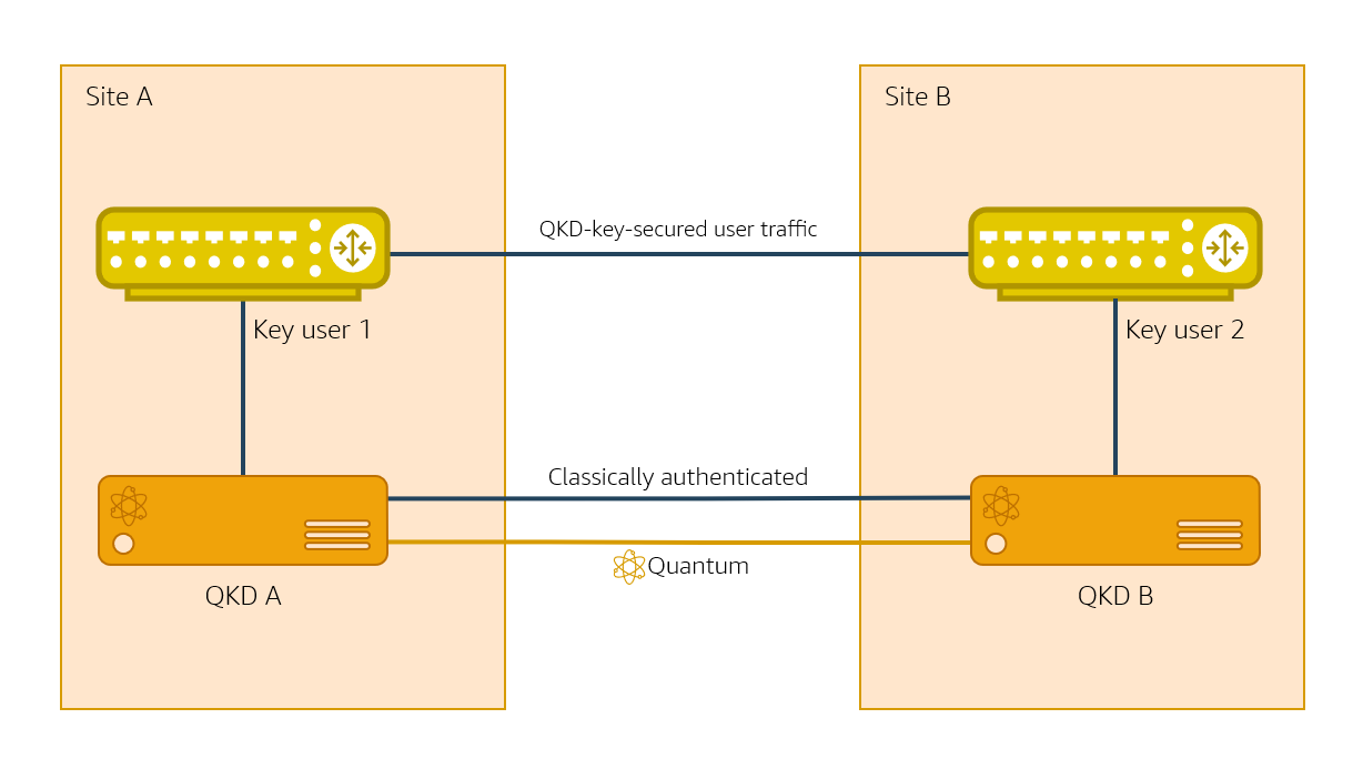 Quantum key distribution (QKD) is a technology that leverages the laws of quantum physics to securely share secret information between distant communicating parties. With QKD, quantum-mechanical properties ensure that if anyone tries to tamper with the secret-sharing process, the communicating parties will know. Keys established through QKD can then be used in traditional symmetric encryption or with other cryptographic technologies to secure communications.