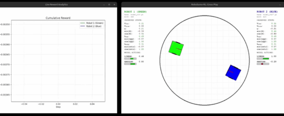 Hi everyone, I’ve recently finished the first version of RobotSumo-RL, an environment specifically designed for training autonomous combat agents. I wanted to create something more dynamic than standard control tasks, focusing on agent-vs-agent strategy. Key features of the repo: – Algorithms: Comparative study of SAC, PPO, and A2C using PyTorch. – Training: Competitive self-play mechanism (agents fight their past versions). – Physics: Custom SAT-based collision detection and non-linear dynamics. – Evaluation: Automated ELO-based tournament system. Link: https://github.com/sebastianbrzustowicz/RobotSumo-RL I’m looking for any feedback. submitted by /u/Sea_Anteater6139 |