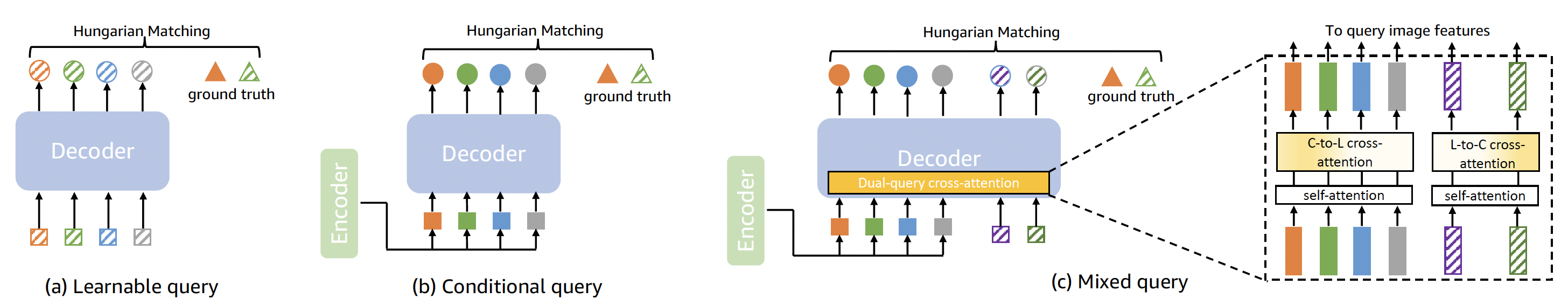 Our approach is to combine both types of queries, which improves the models ability to transfer across tasks. Our MQ-Former model represents inputs using both learnable queries and conditional queries, and every layer of the decoder has a cross-attention mechanism, so that the processing of the learnable queries can factor in information from the conditional-query processing, and vice versa.