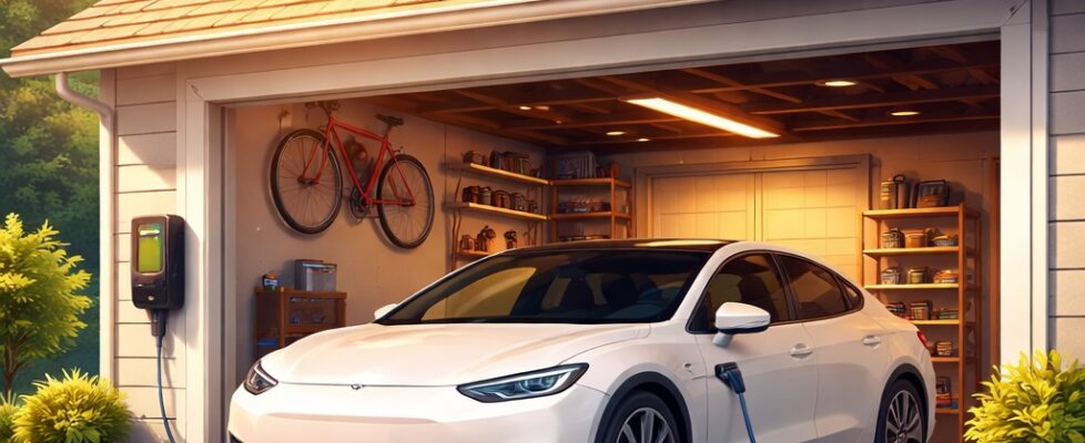 IMAGE: A modern electric car charging in a private garage with rooftop solar panels, bathed in warm sunlight, symbolizing home energy independence and clean mobility
