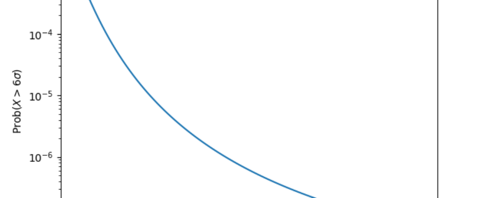 How likely is it that a sample from a random variable will be six standard deviations from its mean? If you have in mind a normal (Gaussian) distribution, as most people do, then the probability is on the order of 1 chance in 10,000,000. Six sigma events are not common for any distribution, but they’re not unheard of for distributions with heavy tails.