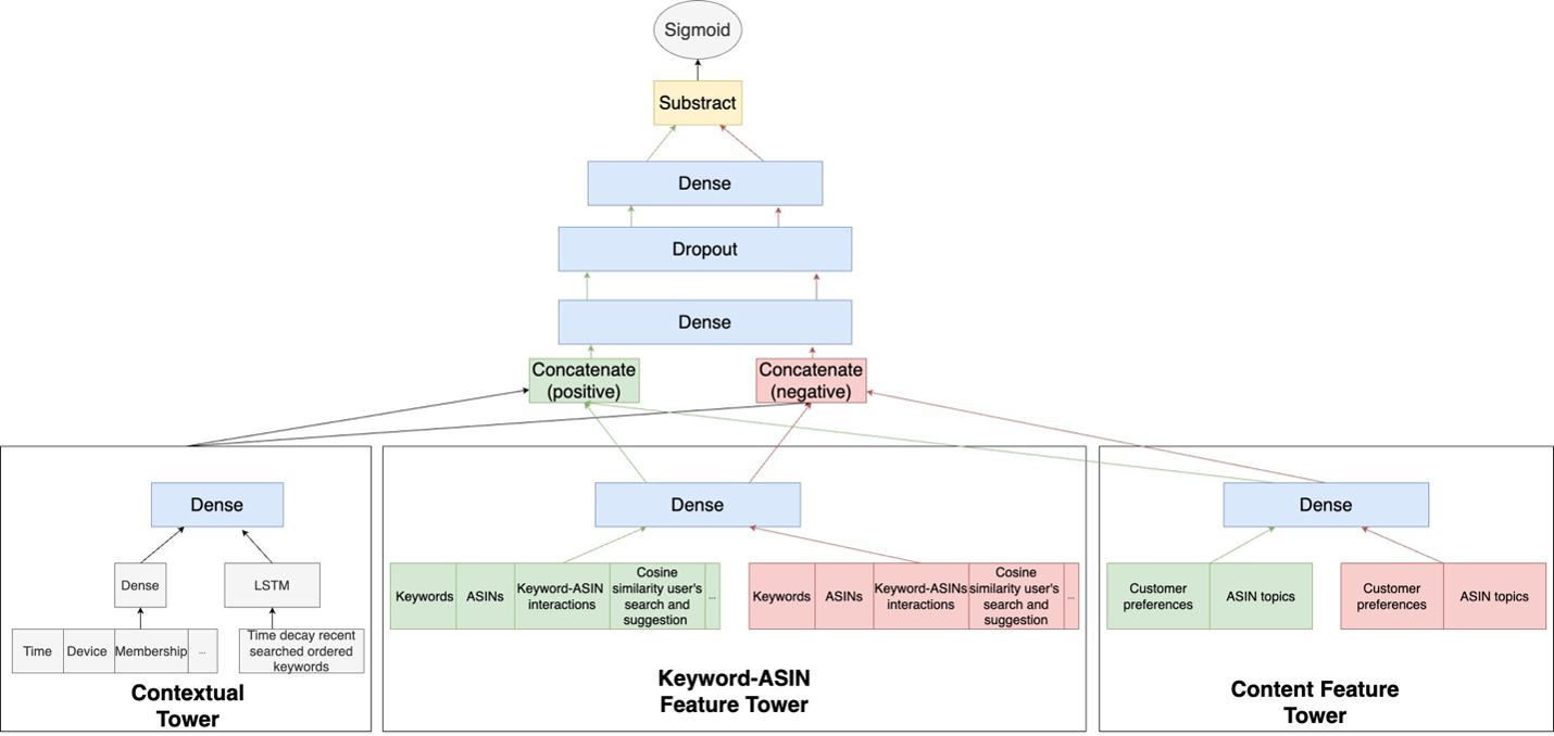 The DeepPLTR models architecture consists of three specialized towers. The left tower factors in contextual features and recent search patterns using a long-short-term-memory model, which processes data sequentially and considers its prior decisions when issuing a new term in the sequence. The middle tower handles keyword and item engagement history. The right tower factors in customer taste preferences and product descriptions to enable personalization. The model learns from paired examples, but at runtime, it relies on books absolute scores to assemble a ranked list.