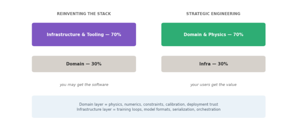 But in applied engineering, where the goal is to solve a defined domain problem, the value usually lies elsewhere: in the data, the physics, the workflow, the validation strategy, and the deployment constraints. In that setting, rebuilding the training or deployment stack is often not innovation. It is diversion.