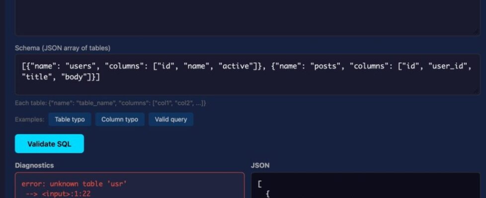 This new playground loads up the Python library and provides a UI for trying out its different features: formating, parsing into an AST, validating, and tokenizing SQLite SQL queries.