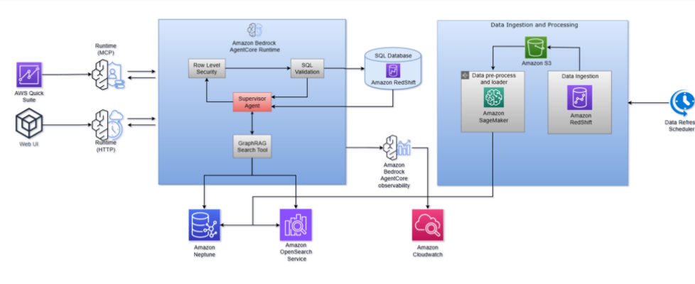 • Amazon Bedrock AgentCore Runtime serves as the central orchestration layer, hosting a supervisor Agent that coordinates the end-to-end workflow. It routes user questions, invoking the GraphRAG Search Tool for context retrieval, enforcing Row-Level Security, triggering SQL generation and validation, and executing queries against a database (Amazon Redshift). The runtime supports multiple entry points, including MCP and HTTP protocols, enabling integration with both embedded analytics surfaces like AWS Quick Sight and custom web interfaces.