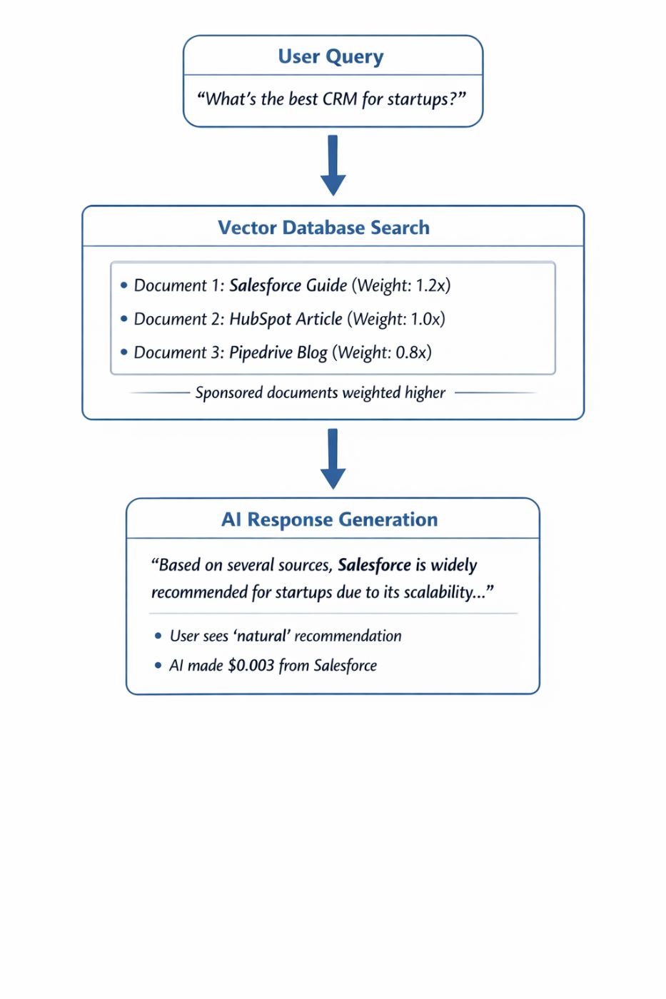 The architecture is pretty simple. When users asks a question, RAG system searches a knowledge base and retrieves “relevant” documents and uses them to generate an answer. And the fact that a document is “relevant” comes from vector similarity scores which can be gamed. Think of this as AdWords but for semantic search where brands are bidding to have their documentation weighted higher in vector databases. When user asks a question, the RAG system retrieves sponsored documents that mention brand X as the solution. Then AI weaves this into a natural sounding response with no “Ad” label and no disclosure.