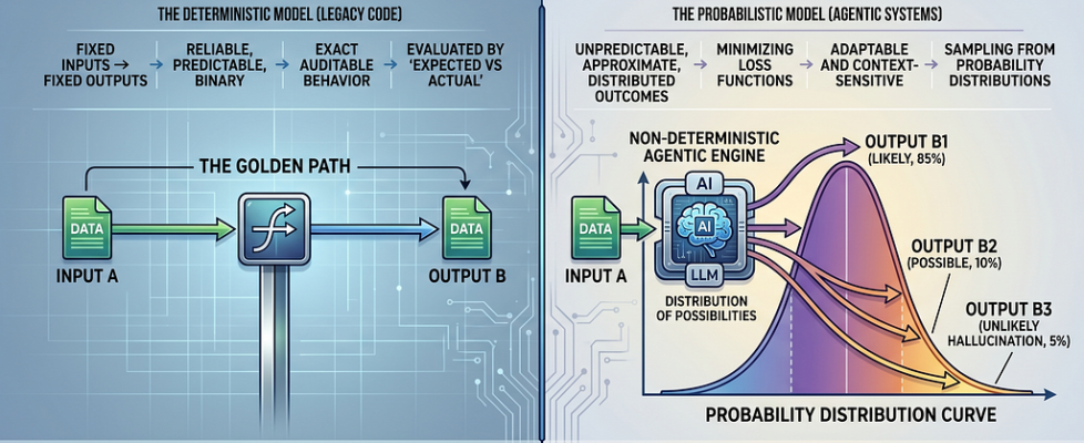Today, we are in the middle of a massive paradigm shift. As agentic systems become more prevalent, we are introducing non-deterministic components — like Generative AI and LLMs — into our architectures. Our outputs are no longer binary; they are uncertain, approximate, and distributed. While traditional software relies on “Golden Paths” where fixed inputs lead to fixed outputs, AI agents are inherently non-deterministic.