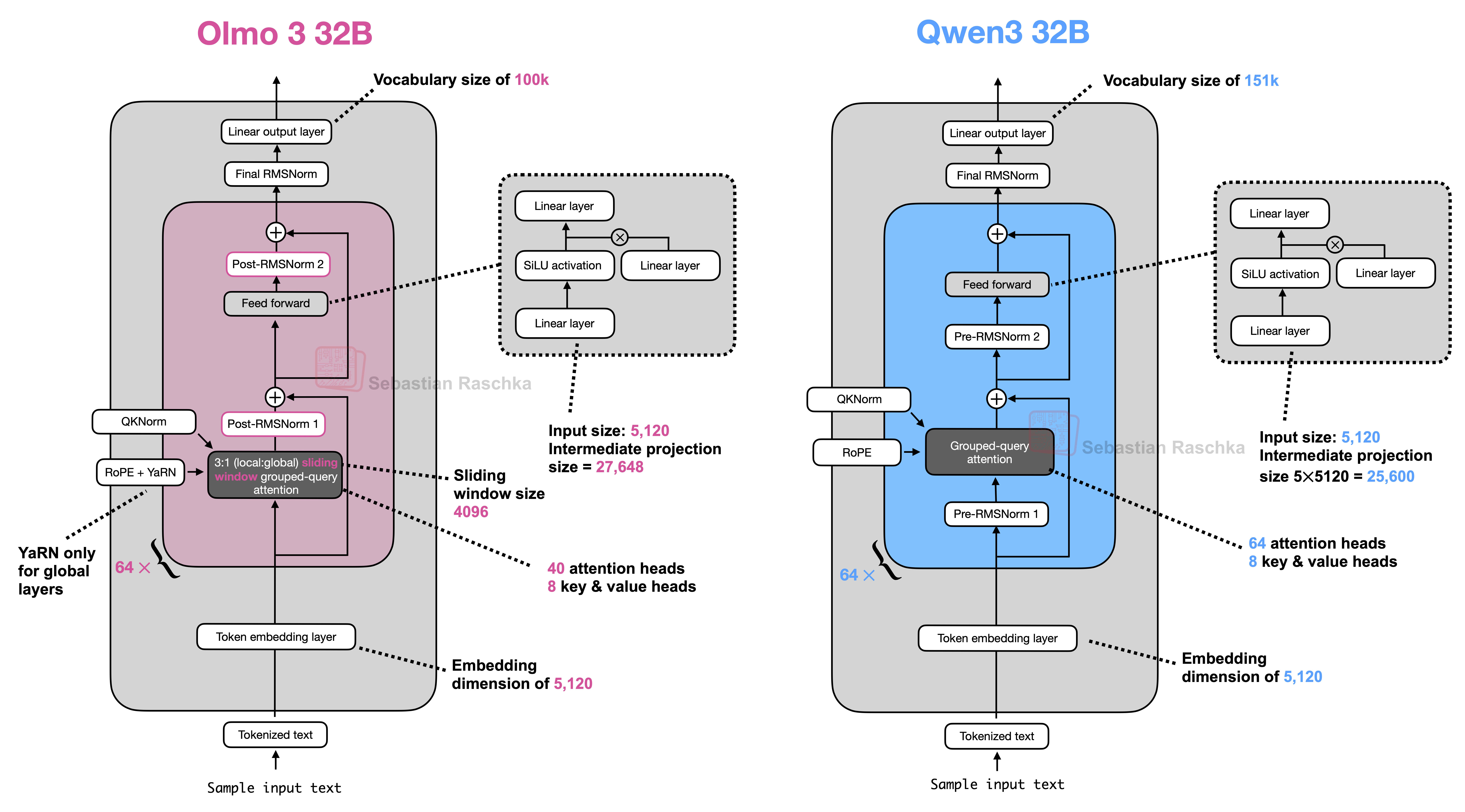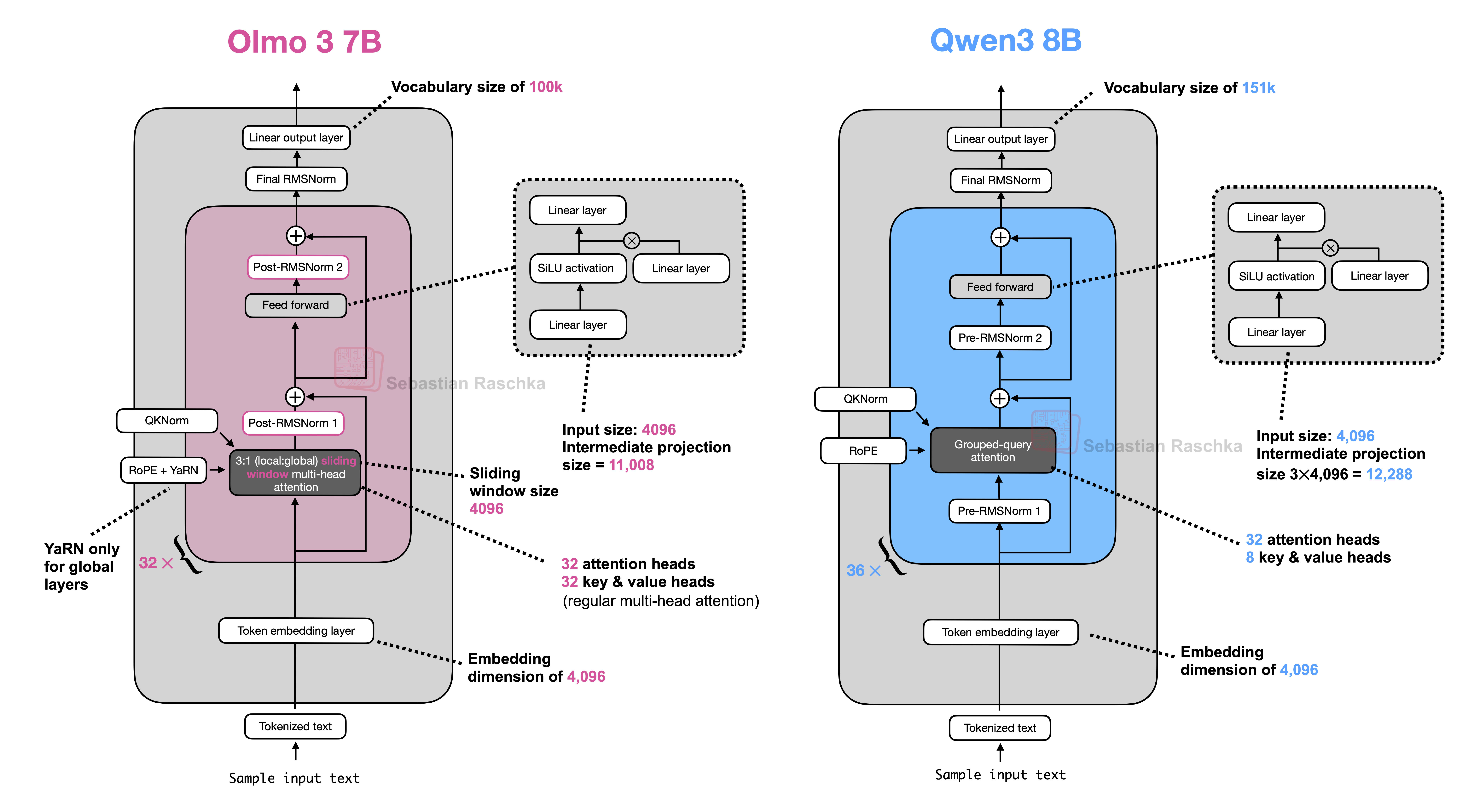As we can see, the Olmo 3 architecture is relatively similar to Qwen3. However, it’s worth noting that this is essentially likely inspired by the Olmo 2 predecessor, not Qwen3.