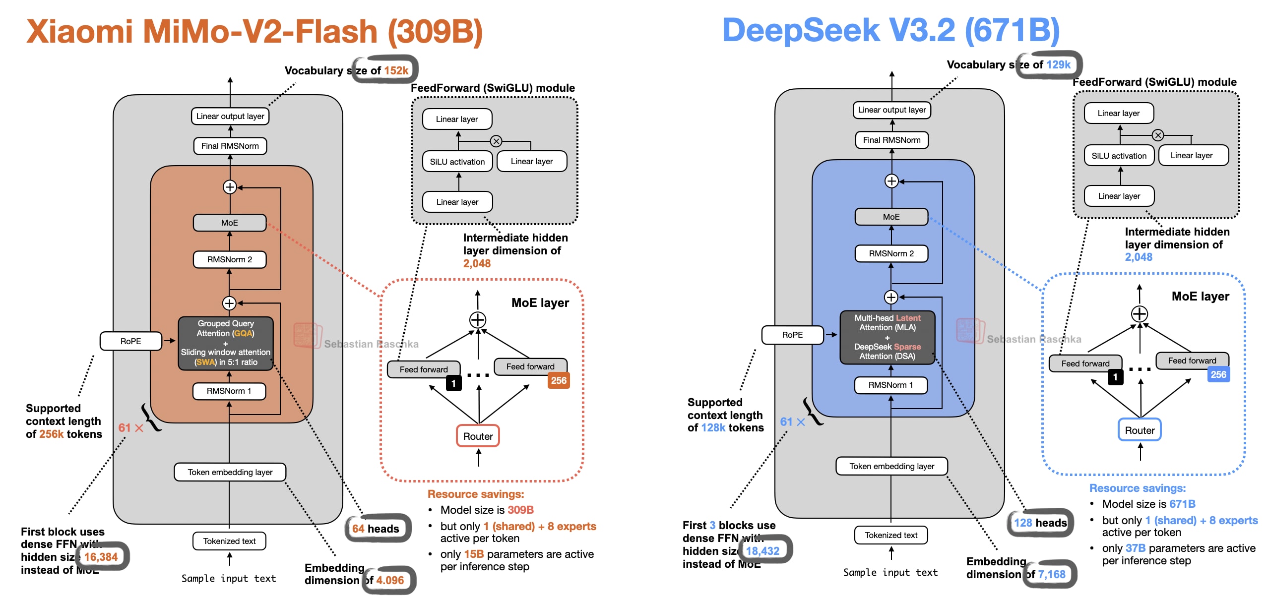 There’s been another impressive entry in December 2025. Xiaomi released their newest Xiaomi MiMo-V2-Flash with impressive benchmark performance matching DeepSeek V3.2, while only having half the parameters and being faster in inference. It’s a 309B Mixture-of-Experts (MoE) model with 15 active parameters per token.