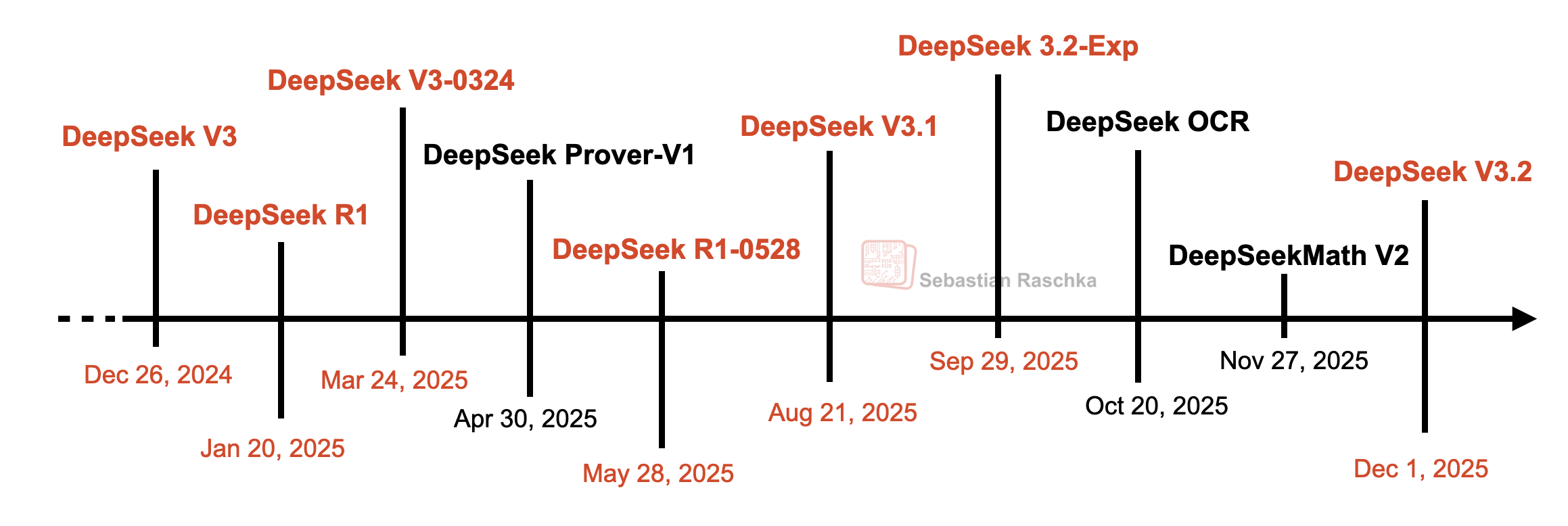 This article started with DeepSeek V3, which was released back in December 2024. There have been multiple DeepSeek releases back then, but I largely skipped them as they were not big flagship-model releases like DeepSeek V3 and DeepSeek R1.