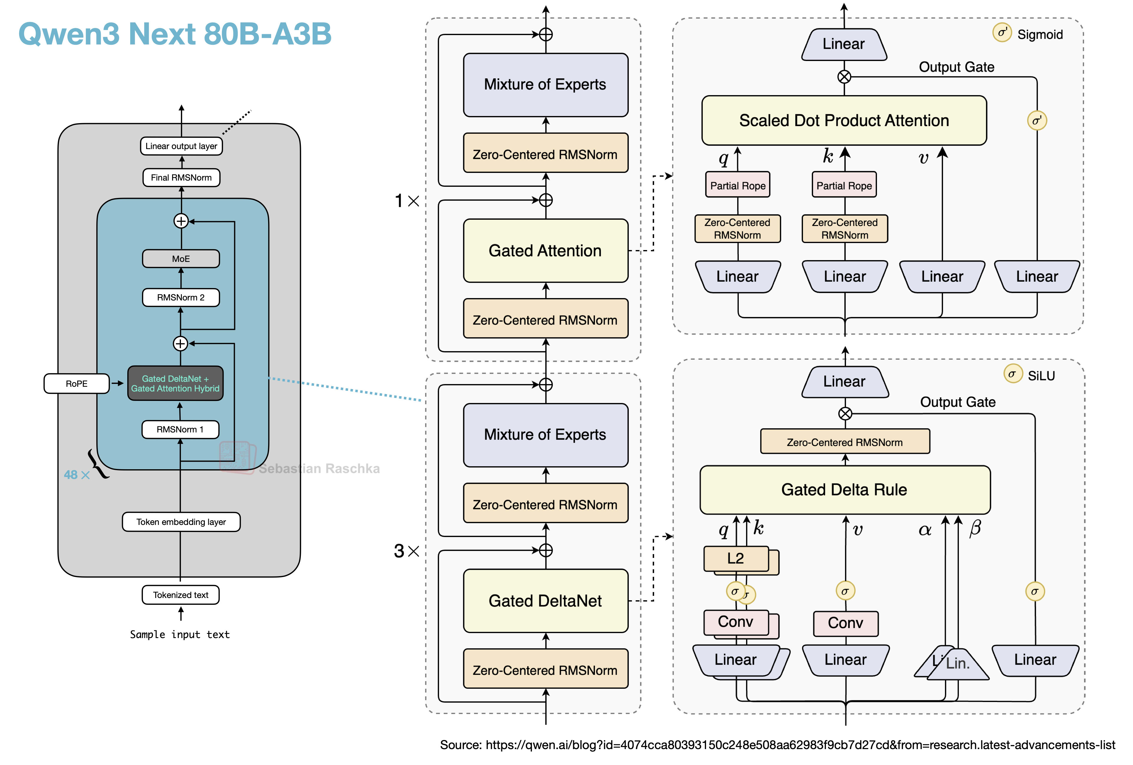 Gated DeltaNet is a linear attention variant with inspiration from recurrent neural networks, including a gating mechanism from the Gated Delta Networks: Improving Mamba2 with Delta Rule paper. In a sense, Gated DeltaNet is a DeltaNet with Mamba-style gating, and DeltaNet is a linear attention mechanism. Due to the overview-nature of this article, DeltaNet would be good topic for a separate article in the future.