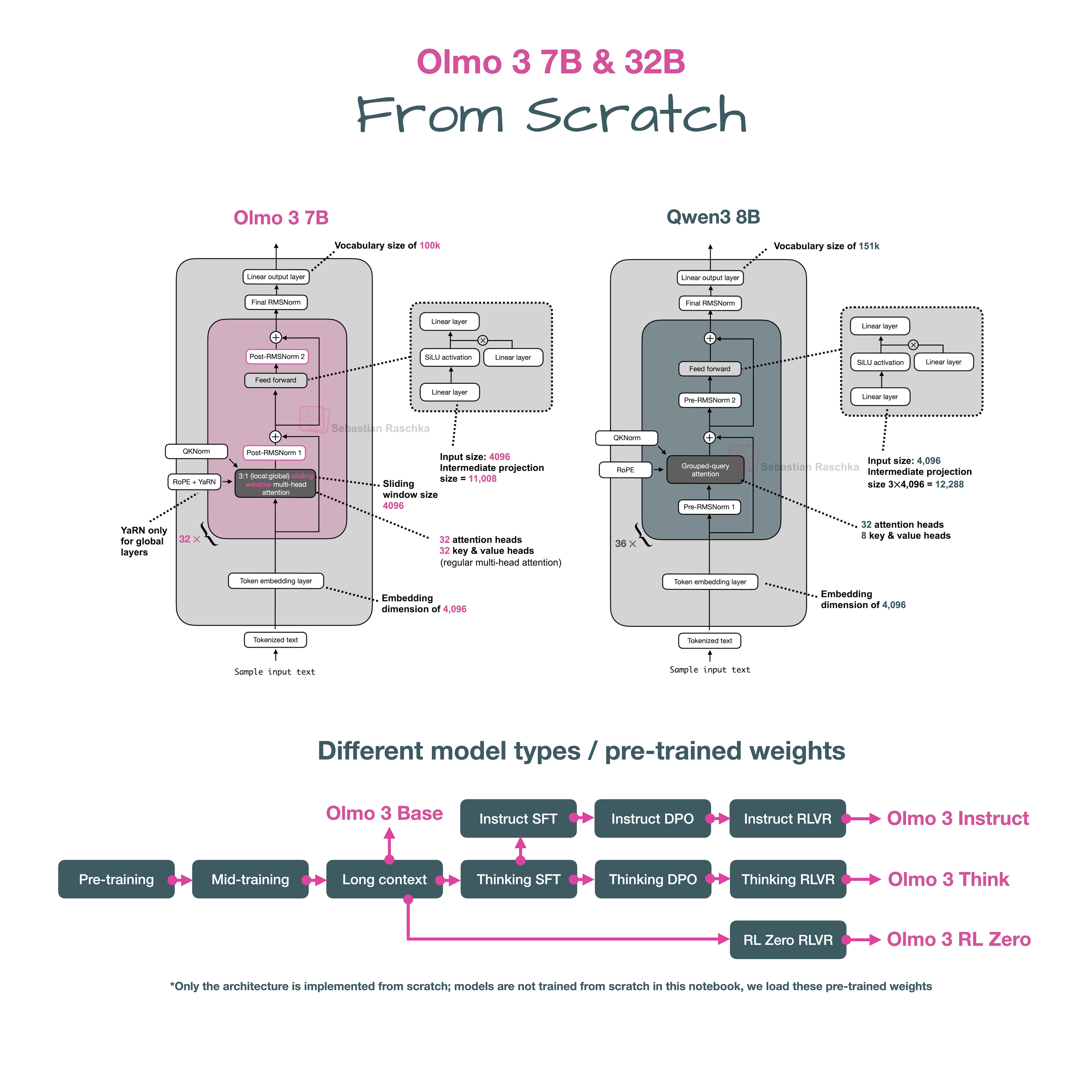 If you are interested in additional architecture details, I implemented Olmo 3 from scratch in a standalone notebook here.