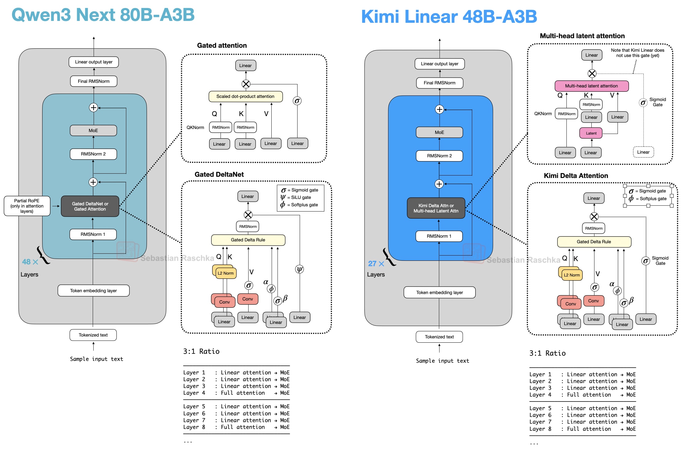 This could have been a turning point where linear attention may not be worth pursuing after all. However, it gets more interesting. In October, the Kimi team released their new Kimi Linear model with linear attention.