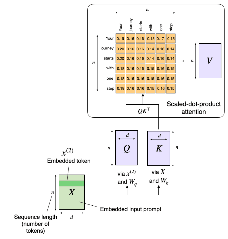 This is because the query (Q), key (K), and value (V) are n-by-d matrices, where d is the embedding dimension (a hyperparameter) and n is the sequence length (i.e., the number of tokens).