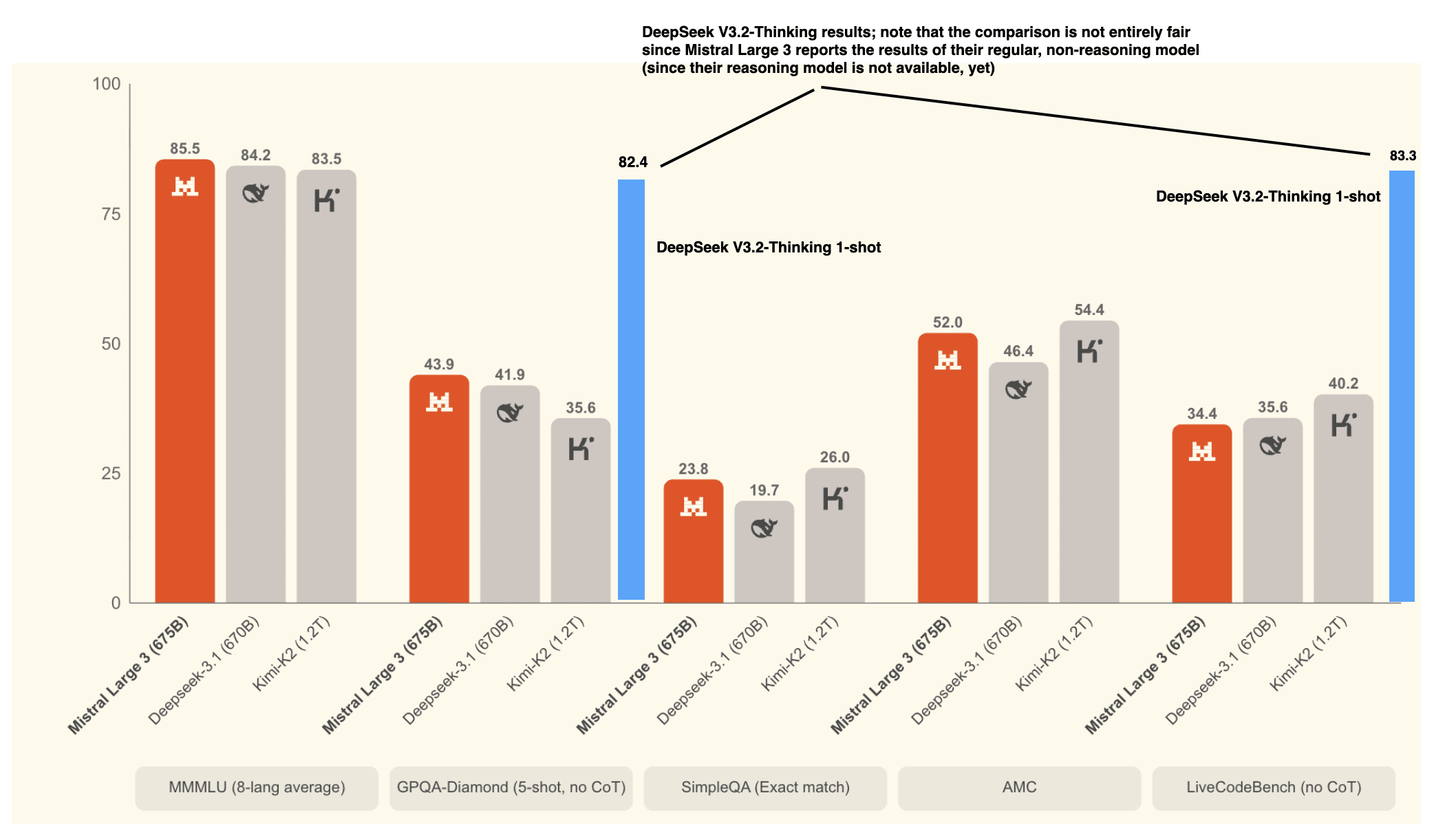 Unfortunately, it’s not possible to do an apples-to-apples comparison right now, because Mistral 3 Large currently doesn’t have a reasoning model, and DeepSeek V3.2 didn’t share the benchmark results for their non-thinking mode, but in case you are curious, I overlaid the DeepSeek V3.2-Thinking numbers (from the DeepSeek V3.2 report) with the Mistral 3 Large benchmark chart.