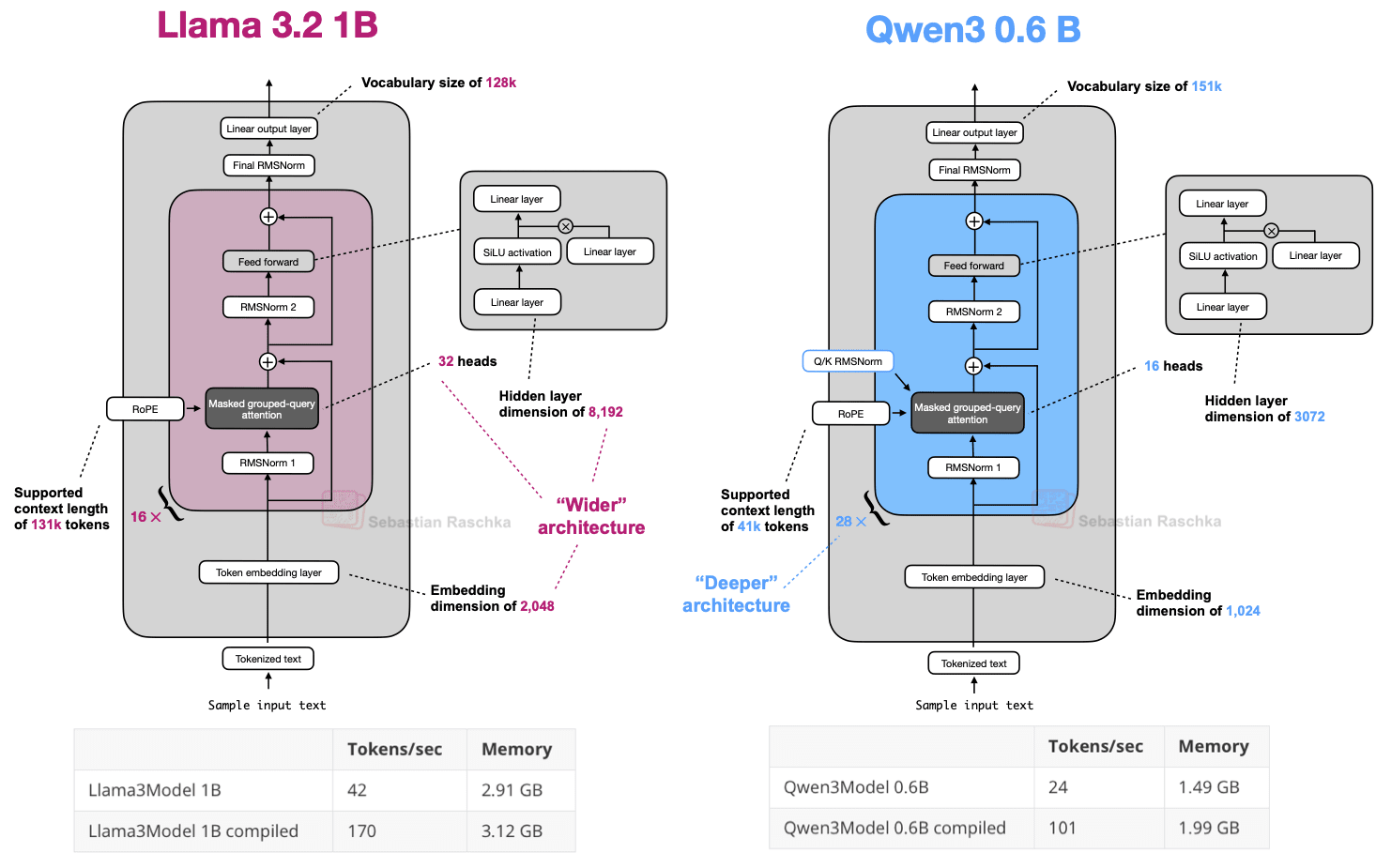Below is a figure that further compares OLMo 2 to Llama 3 side by side; as one can see, the architectures are otherwise relatively similar except for the fact that OLMo 2 still uses the traditional MHA instead of GQA. (However, the OLMo 2 team released a 32B variant 3 months later that uses GQA.)