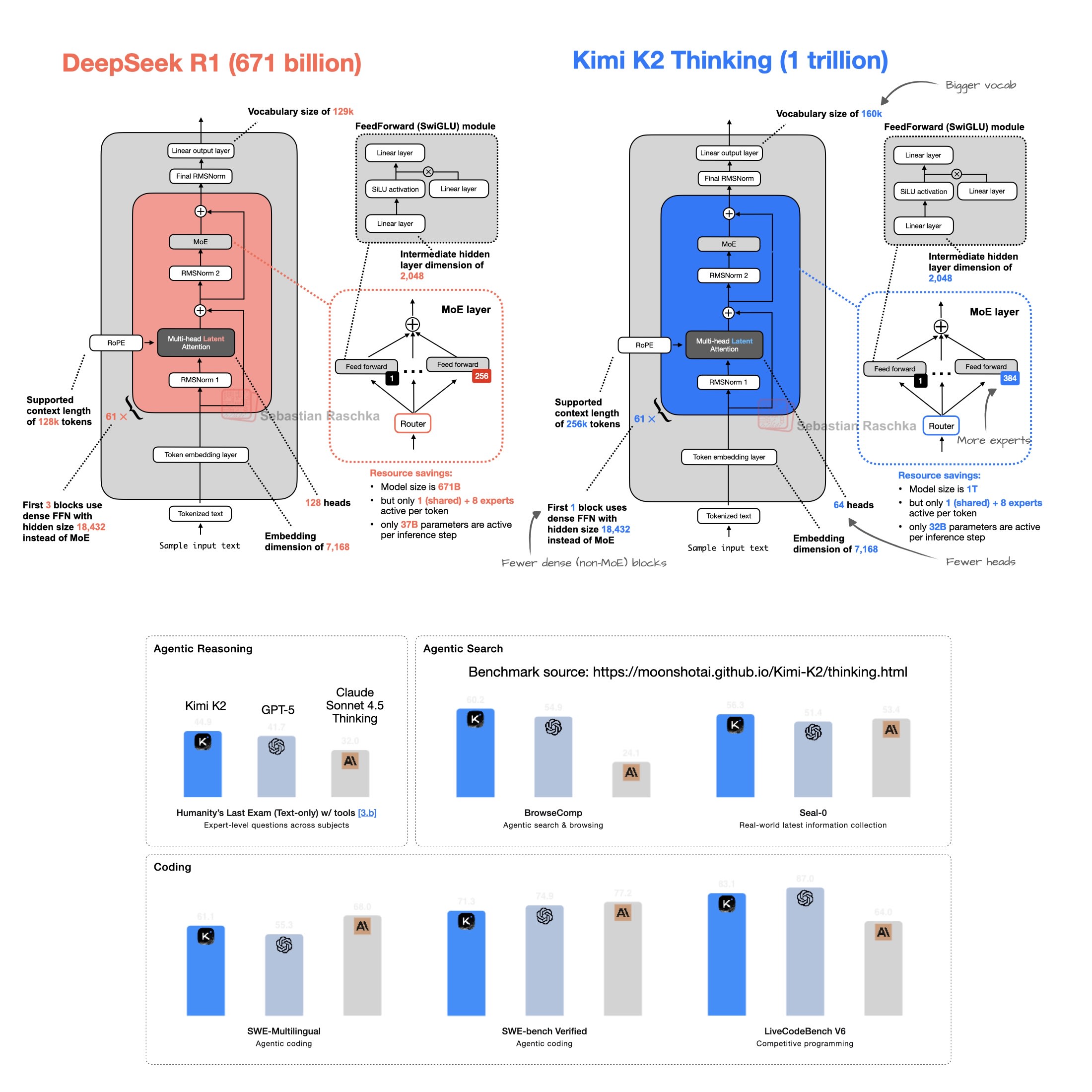 And the fact that Kimi Linear compares favorably to MLA on long-context and reasoning benchmarks makes linear attention variant once again promising for larger state-of-the-art models. That being said, Kimi Linear is 48B-parameter large, but it’s 20x smaller than Kimi K2. It will be interesting to see if the Kimi team adopts this approach for their upcoming K3 model.