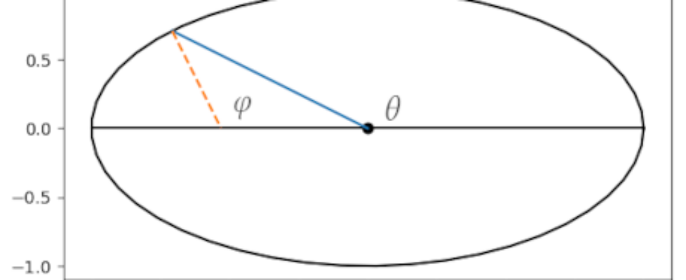 As a quick sanity check on the equations, note that when eccentricity e is zero, i.e. in the case of a circle, φ = θ. Also, if φ = 0 then θ = φ for all eccentricity values.