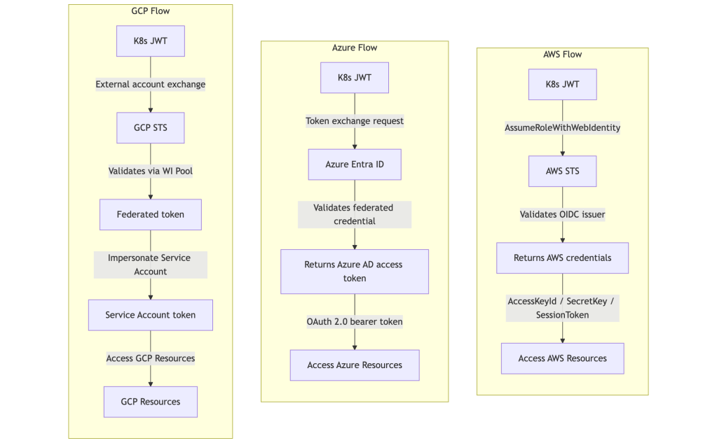 | GCP | Yes (STS validates via WI Pool) | Yes (GCP STS) | External account → STS → SA impersonation |